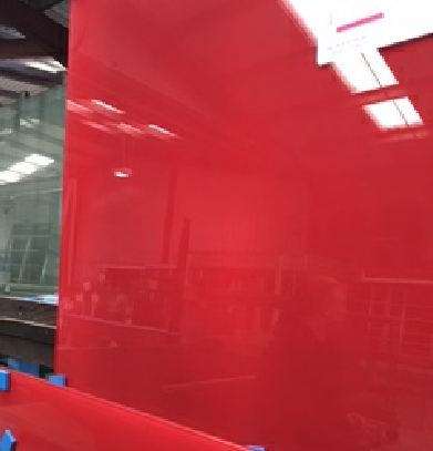 First the glass is cut and processed. Glass can be cut to almost any size and shape, and can have drill holes and/or cutouts for sockets or hinges. The paint mix is made to order before being evenly applied to back of the glass. All splashbacks come with a filmed backing to protect the paint which adhesive can be applied directly to.